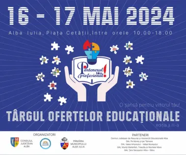 Târgul ofertei educaționale 2025 – Organizat de Consiliul Județean Alba, Inspectoratul Școlar Județean Alba, Primăria Municipiului Alba Iulia, și CJRAE Alba, Târgul Ofertelor Educaționale-ediția a IV a, ce se desfășoară în perioada 15-16 mai 2025, în Piața Cetății Alba Carolina din Alba Iulia, este un eveniment de promovare a ofertei educaționale din domeniul tehnologic organizat în cadrul proiectului ”Partenerul tău profesional”, ce reunește companii din domenii de pregătire reprezentative și unități de învățământ tehnologic din județul Alba.