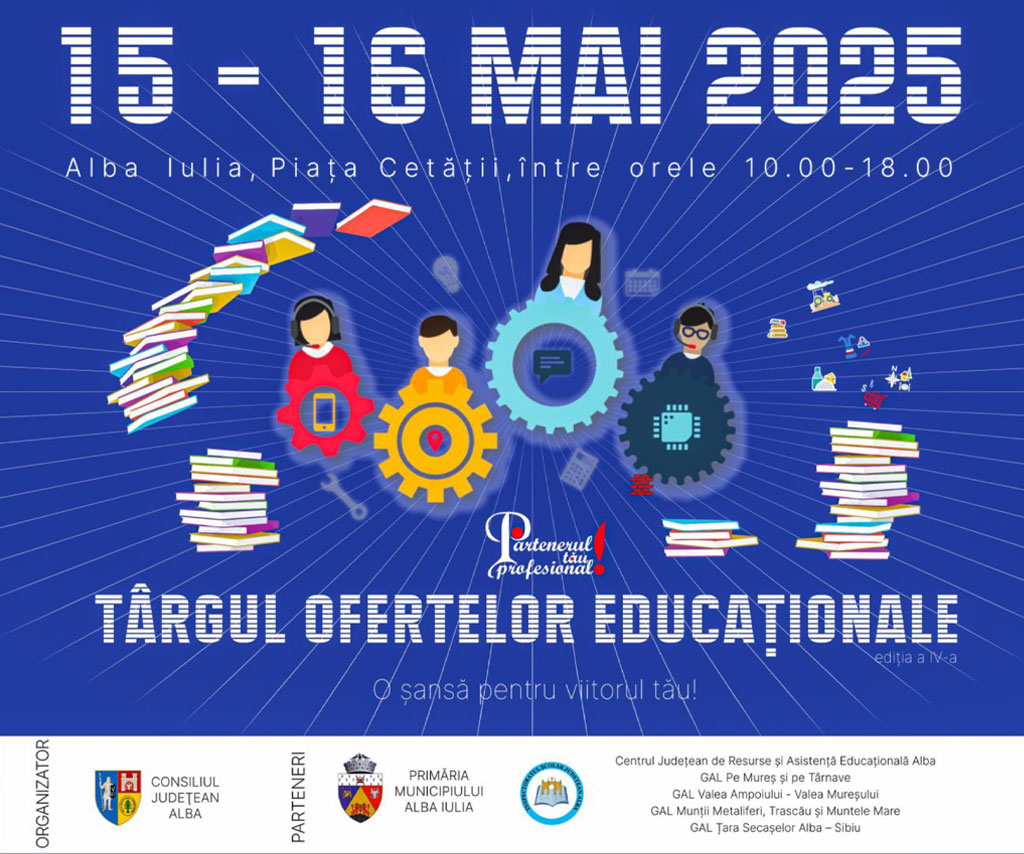 Târgul ofertei educaționale 2025 – Organizat de Consiliul Județean Alba, Inspectoratul Școlar Județean Alba, Primăria Municipiului Alba Iulia, și CJRAE Alba, Târgul Ofertelor Educaționale-ediția a IV a, ce se desfășoară în perioada 15-16 mai 2025, în Piața Cetății Alba Carolina din Alba Iulia, este un eveniment de promovare a ofertei educaționale din domeniul tehnologic organizat în cadrul proiectului ”Partenerul tău profesional”, ce reunește companii din domenii de pregătire reprezentative și unități de învățământ tehnologic din județul Alba.